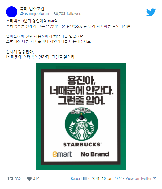 기존의 고급진 이미지였던 신세계와 스타벅스가 일베가 묻었으니.. 이미지 추락은 당연히 시간 문제고 이걸 어떻게 극복하느냐가 참으로 재밌어질 것 같다.